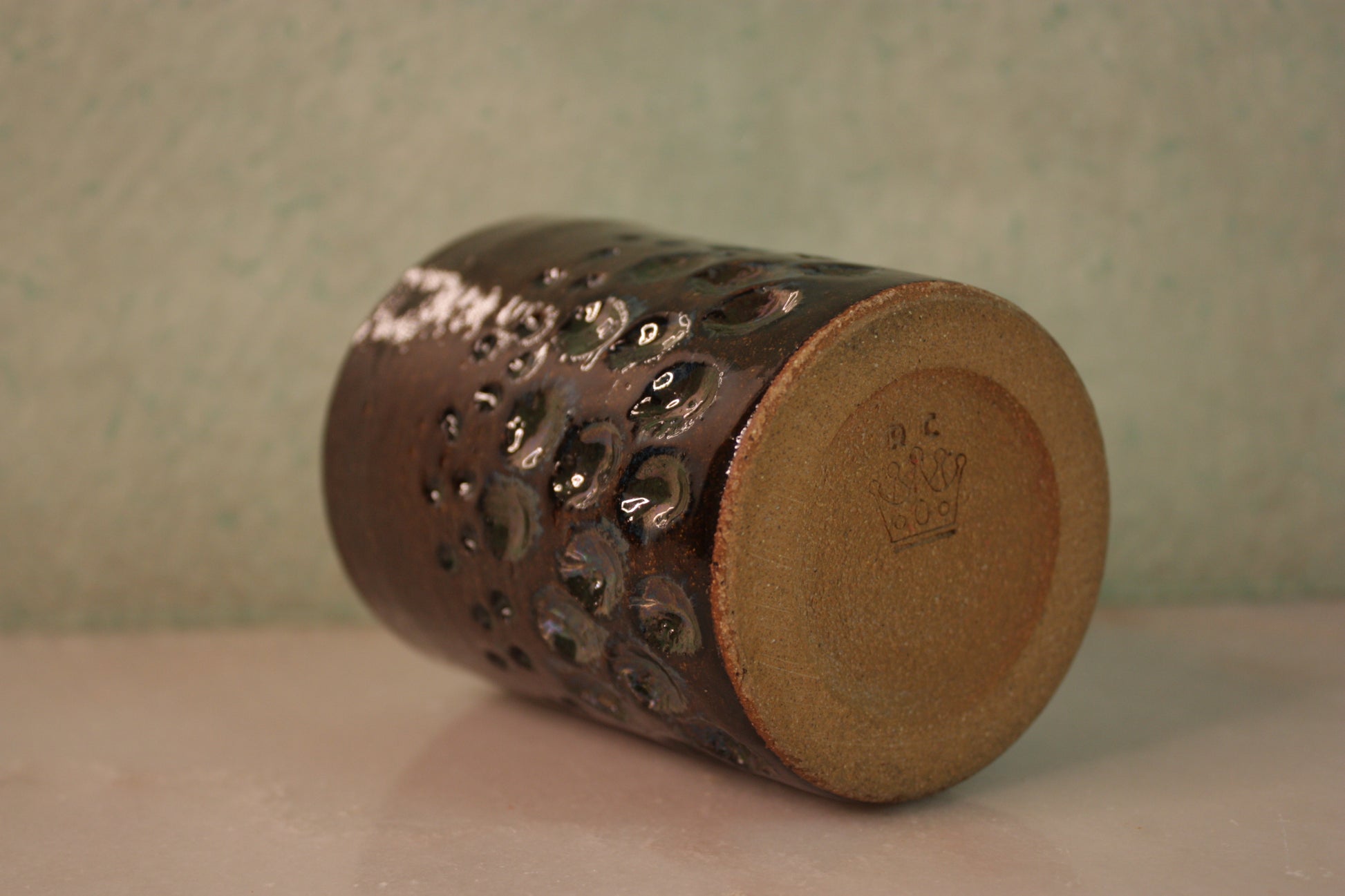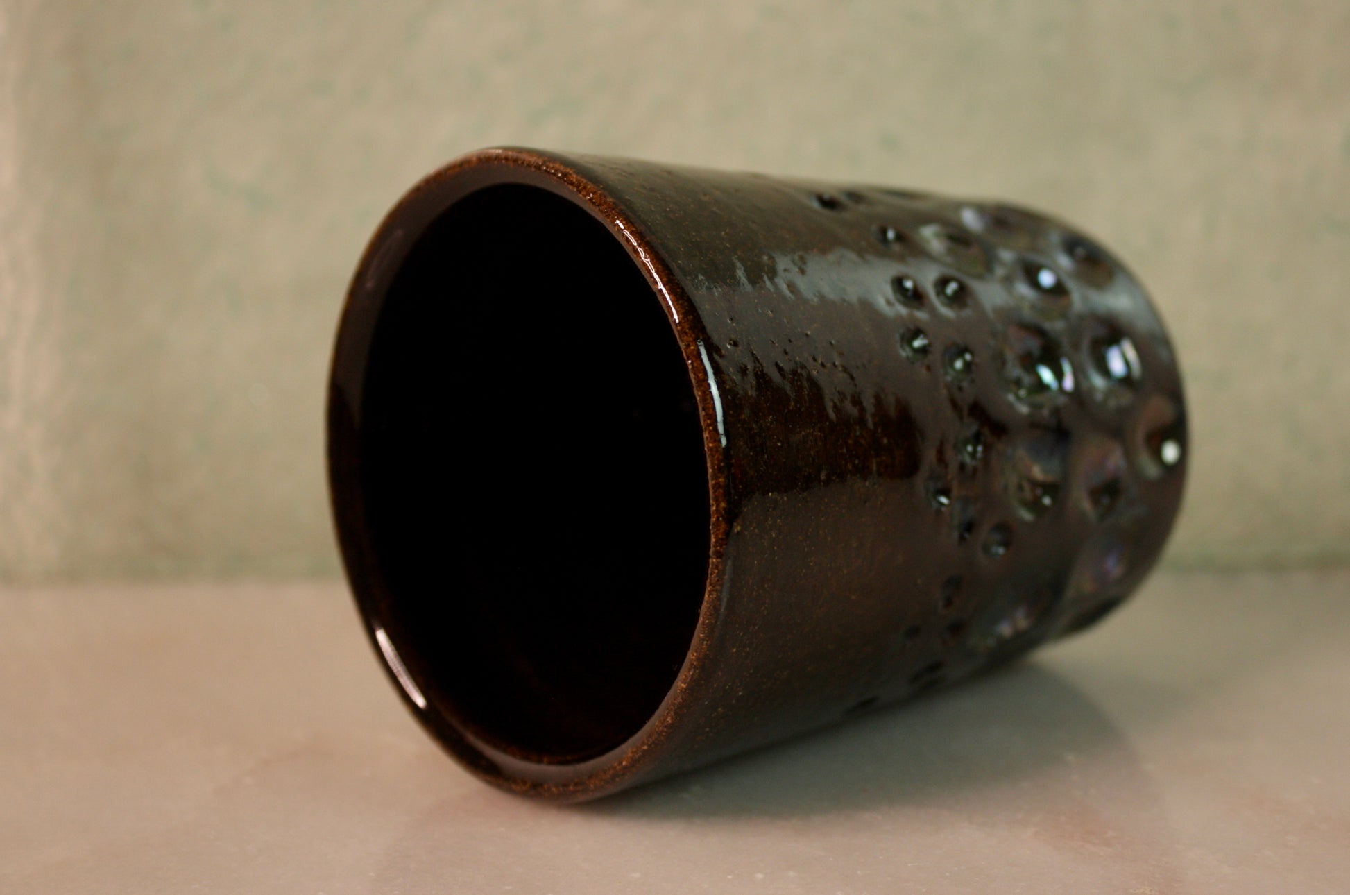 Chocolate Carved Beaker - nice, carefully carved circles, small and larger circles sizes, on this delicate chocolate color beaker, just the right size for an evening drink, or bedside journey before slumber - fits nicely in your hand.
